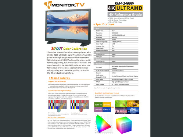3G/ DCI-P3/ HD/ 12 Bit Processing/ REFERENCE GRADE, TRUE non-dithered 10bit Panel/ View 178/ Res. 1920×1200 / +2inputs/ 3DLut-Factory/ Built-in 3DLut/ Bright: 400cd/m2/ Contrast: 1400:1/ Waveform/ Vectorscope/ Histogram/ PIP & PBP KM-2460D, a remarkable new generation film grade monitor,supports 3D-LUT color calibration,cover DCI-P3 color gamut.3Gbs SDI 4:4:4 12Bit signals,no compression,no loss,more perfect display of image,these … Continue reading "GL-KVM2460D-2 Mfr./User Optional/liph-kn"