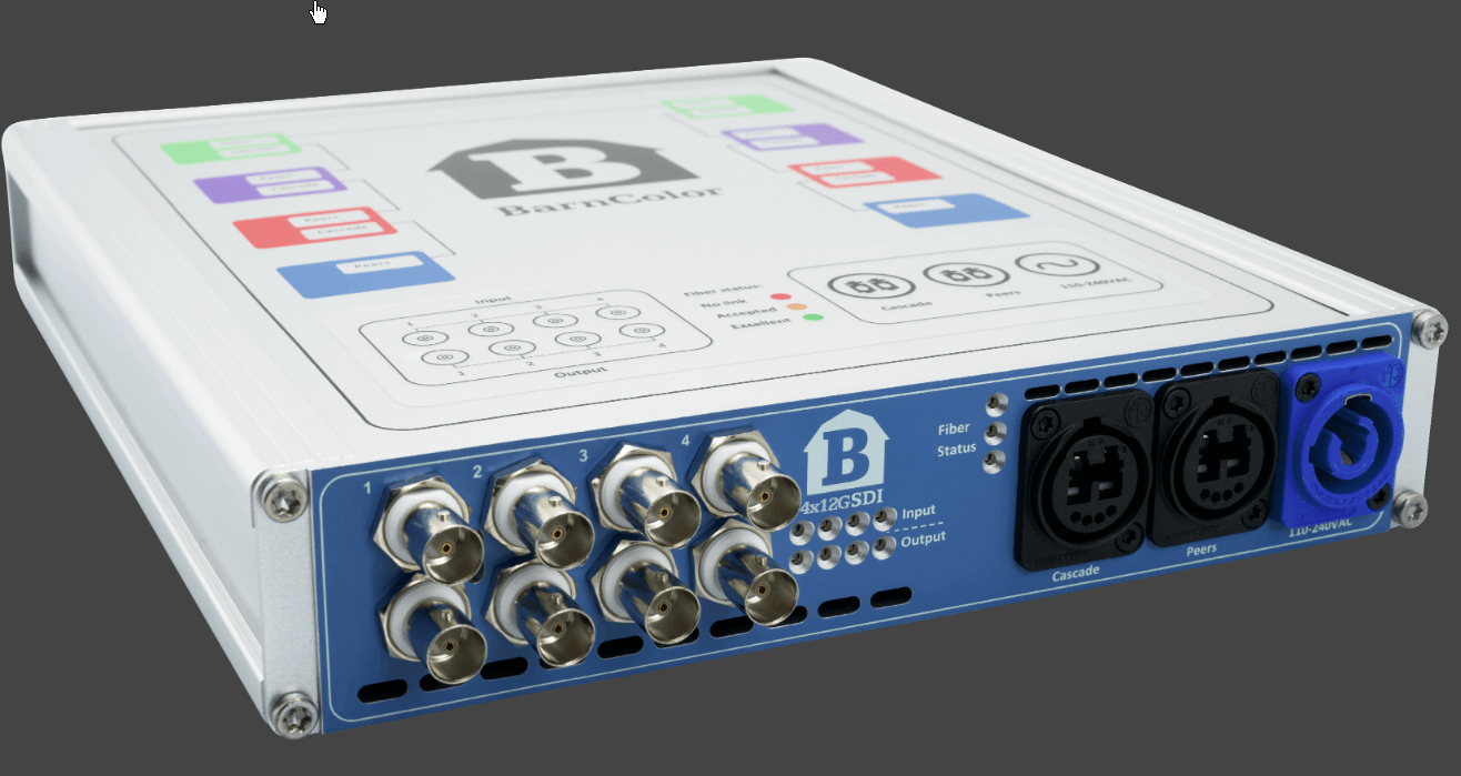 Designed to be a cost-effective and easy-to-deploy solution for transmitting multiple video signals both directions on a single fiber cable. BarnColor allows you to handle up to 32 x 3G-SDI signals (16 forward and 16 returns). Each BarnColor device handles up to 8 signals (4 forward and 4 returns) and up to 4 different colors of BarnColors can be daisy chained. This flexible system is easy to install, upgrade and use. It is well suited for both fixed and temporary installations. THE CONCEPT Each BarnColor pair is available as SDI or Ethernet version and can cascade maximum 4 boxes (colors) on each side. The boxes can be combined in any variation as long as color is different. Maximum transmission distance – medium range. Equipped with rugged connectors. As a pair BarnColor can be coupled as a point to point link and will transmit/receive 4x SDI signals each way. This point to point connection can be done with any color Cascade BarnColor devices can be cascade coupled and all signals for both directions will be transferred into the same fiber connection. Follow the diagram under for connections. You will find the same diagram on top of the device. Specifications:
