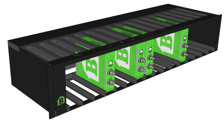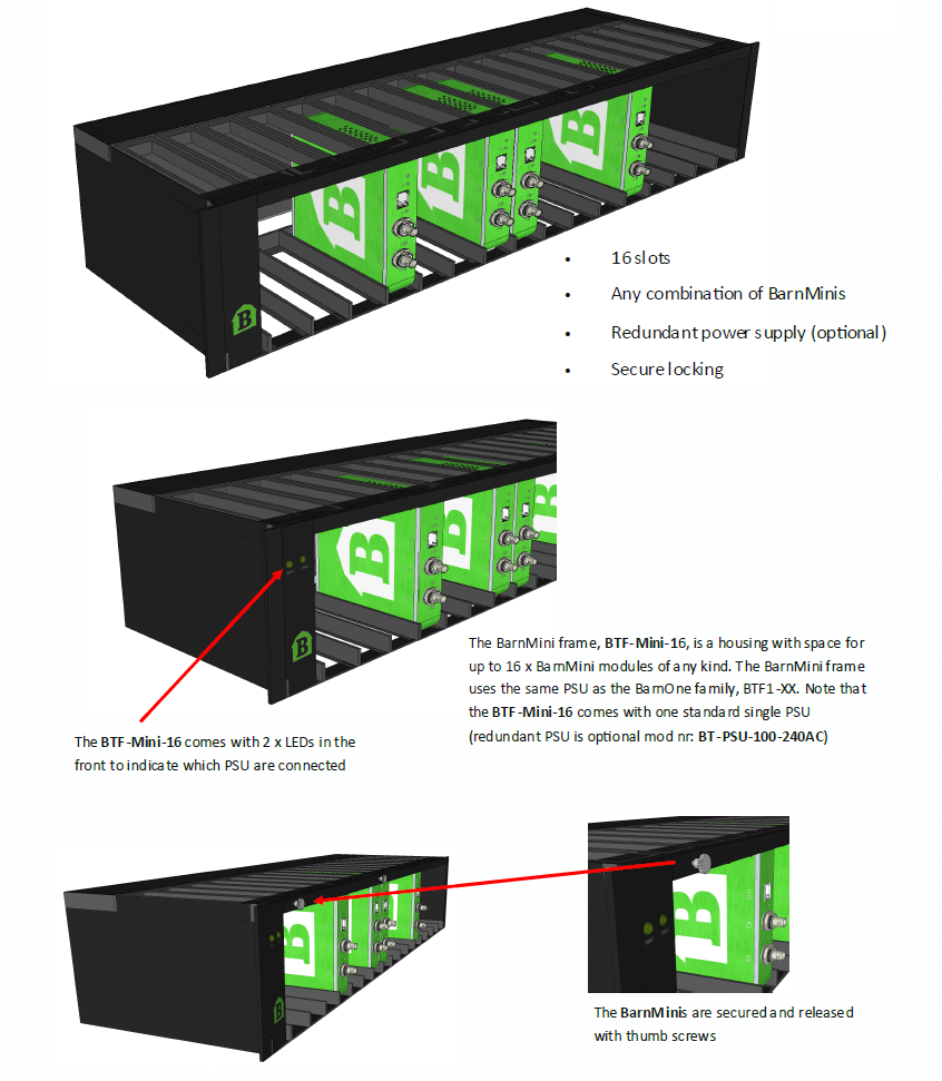 The BarnMini frame, BTF-Mini-16, is a housing with space for up to 16 x BarnMini modules of any kind.