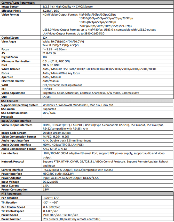 Input/Output Interface Video Output Interfaces HDMI, HDBaseT(POE), LAN(POE), USB3.0(Type A compatible USB2.0), RS232input, RS232output, RS422(compatible with RS485), A-in
